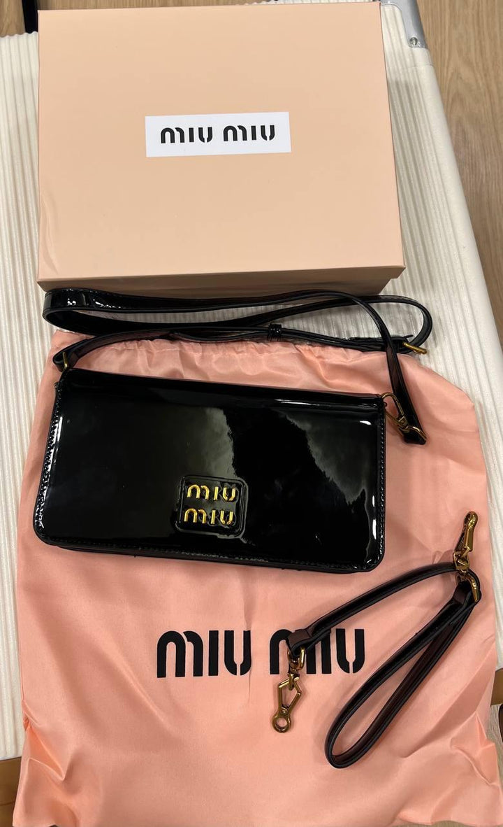 • Hardware: Polished gold-tone Miu Miu–inspired accents